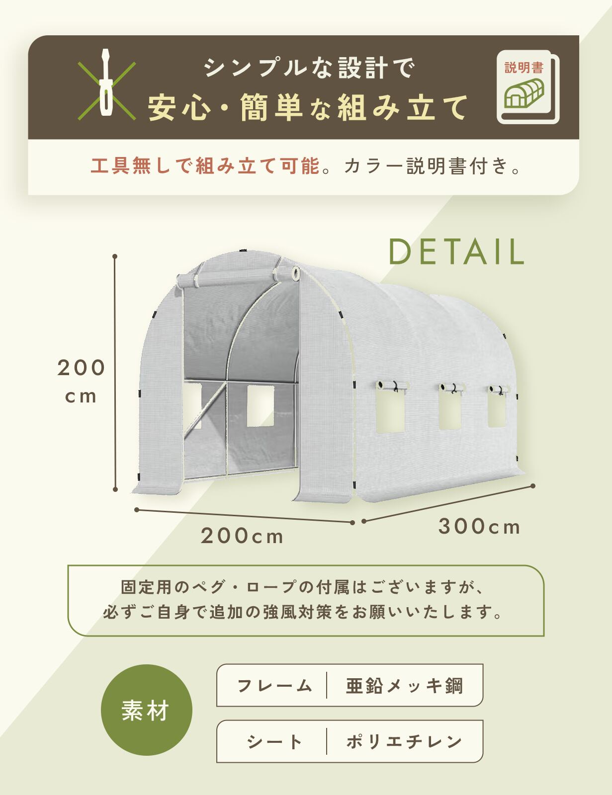 (横)200×(奥)300×(高)200cm:工具不要で組み立て簡単!フルカラー説明書付きで初心者の方でもご利用いただけます。