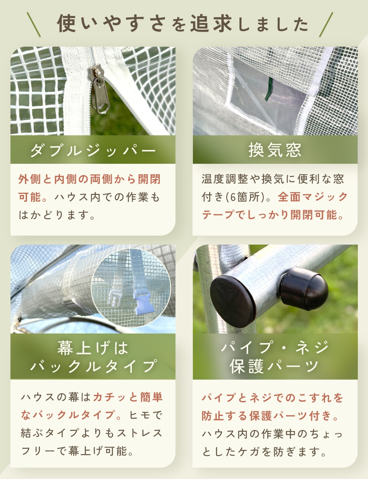 通常のビニールカバーとは異なるポリエチレンビニールカバーで、雨・風・日焼けから植物を守ります。